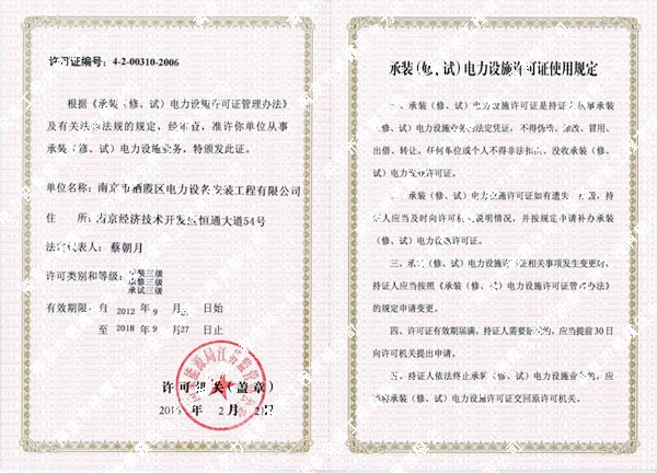 南京市棲霞區(qū)電力設(shè)備安裝工程有限公司是一家專業(yè)從事電力設(shè)計(jì)施工的民營(yíng)企業(yè)。公司于1995年10月成立,2001年7月由棲霞區(qū)土產(chǎn)公司所屬“棲霞區(qū)電力設(shè)備安裝工程處”改制成南京市棲霞區(qū)電力設(shè)備安裝工程有限公司。